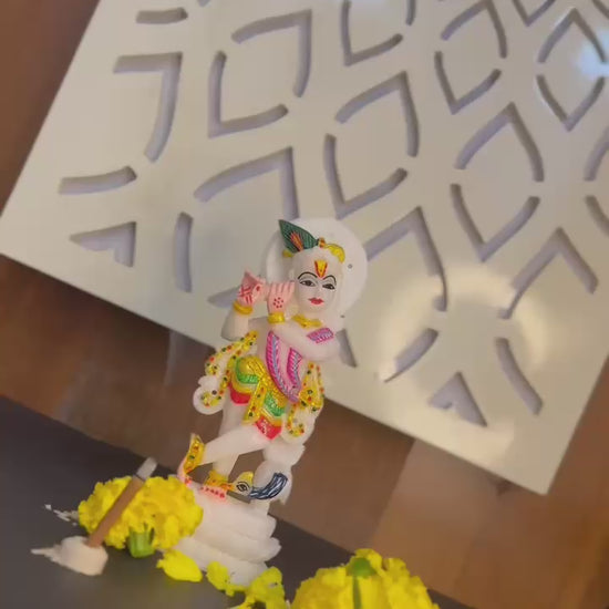 Beautifully handcrafted marble Krishna idol, adorned with vibrant colors and intricate detailing. Perfect for home décor, pooja, or gifting, this divine statue brings positivity, peace, and elegance to any space.”