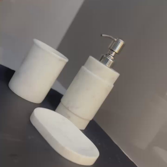A luxurious and elegant three-piece set crafted from genuine white marble. This collection includes a soap dispenser, a tumbler, and a soap dish, perfect for adding a touch of sophisticated style and natural beauty to your bathroom countertop.